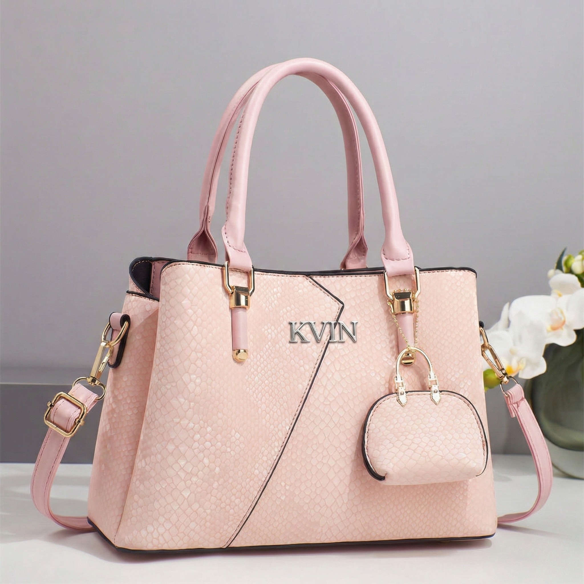 Embrace soft elegance with this charming blush pink tote. Featuring a delicate snakeskin texture, waterproof PU leather, and warm gold-tone hardware, this bag adds a feminine touch to any look. Perfectly sized for daily essentials, it includes a detachable shoulder strap and a matching mini coin purse charm.